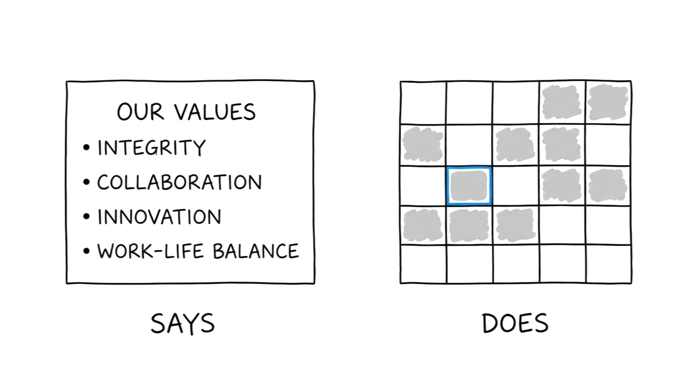 Every organization, every team, every person operates this cycle. The budget says one thing. The strategy deck says another. The calendar reveals priorities the mission statement never mentions. The promotion list rewards behavior the values poster doesn't describe.
