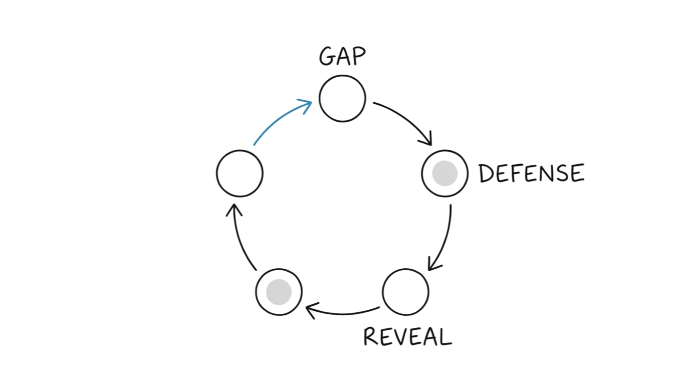 Gap → Defense → Reveal → Repair → Filter → new Gap.