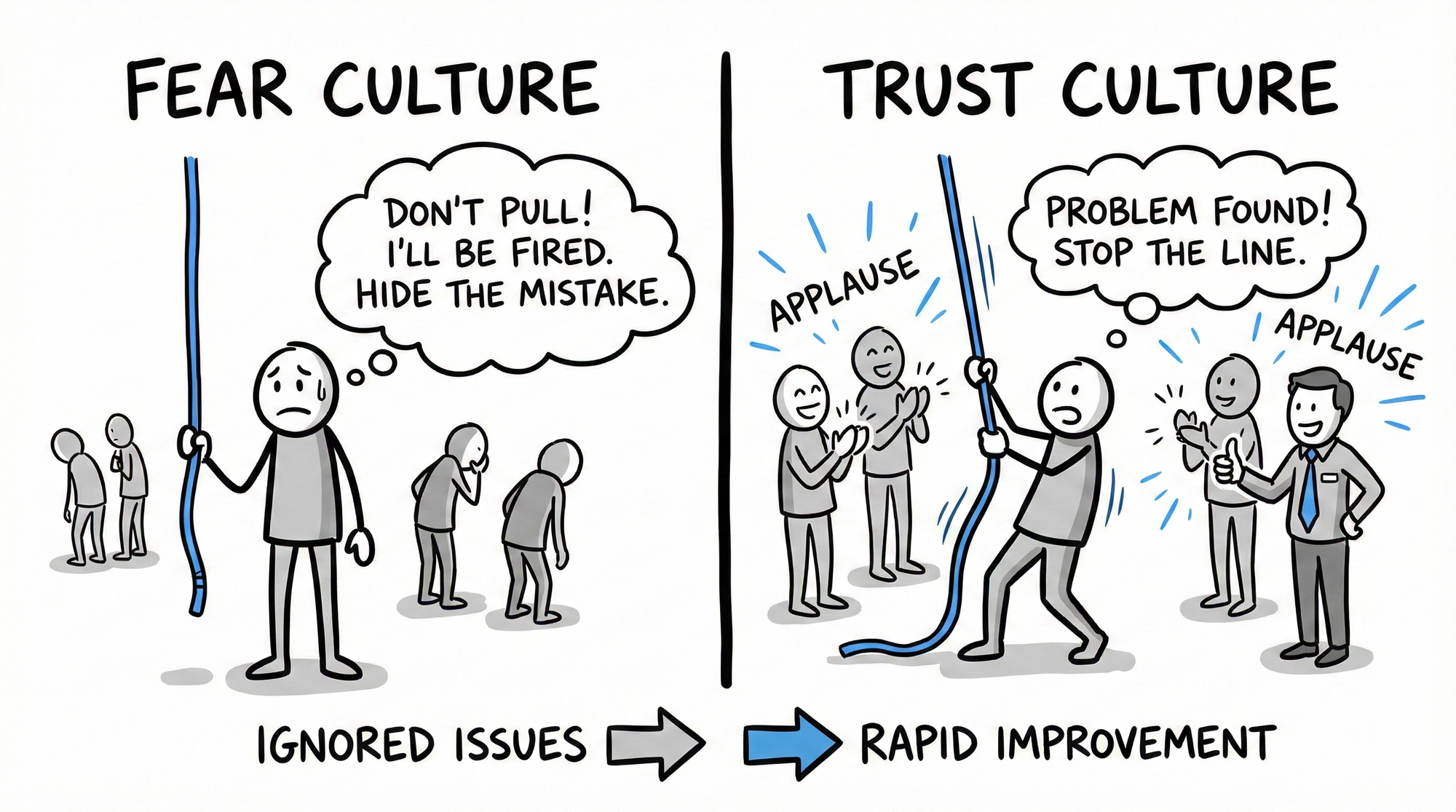 Toyota's policy was explicit: no criticism for pulling the cord. Even false positives never triggered blame. Management promised workers they could stop the line. Then management kept that promise. Day after day. Worker after worker. Until workers believed it.