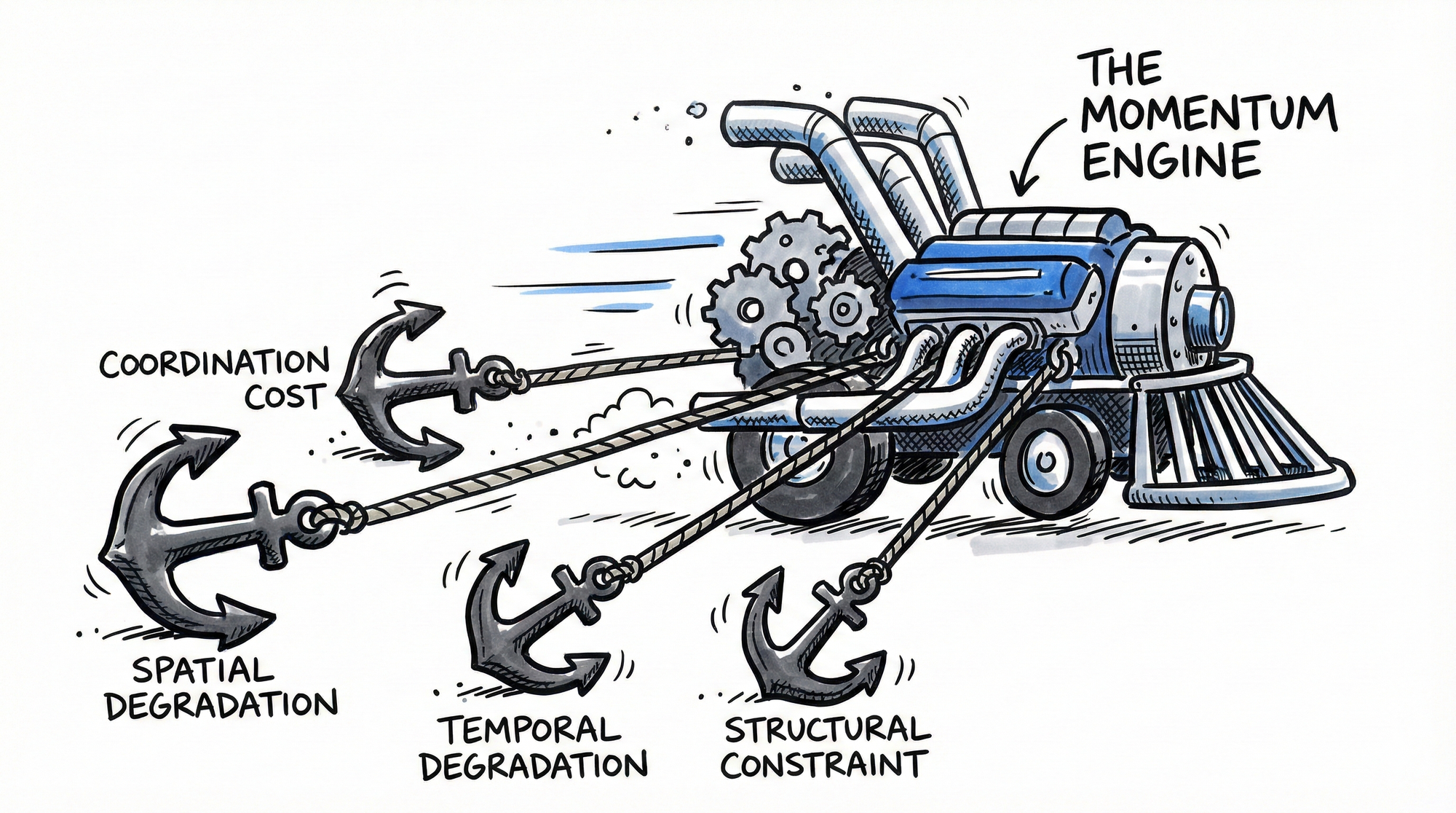 I've spent years studying why organizations slow down, synthesizing patterns from 18 foundational books spanning 50 years, from Brooks's The Mythical Man-Month (1975) to Forsgren's Accelerate (2018). What emerged wasn't a management framework. It was a set of fundamental dynamics that govern organizational velocity the way physics governs falling objects.
