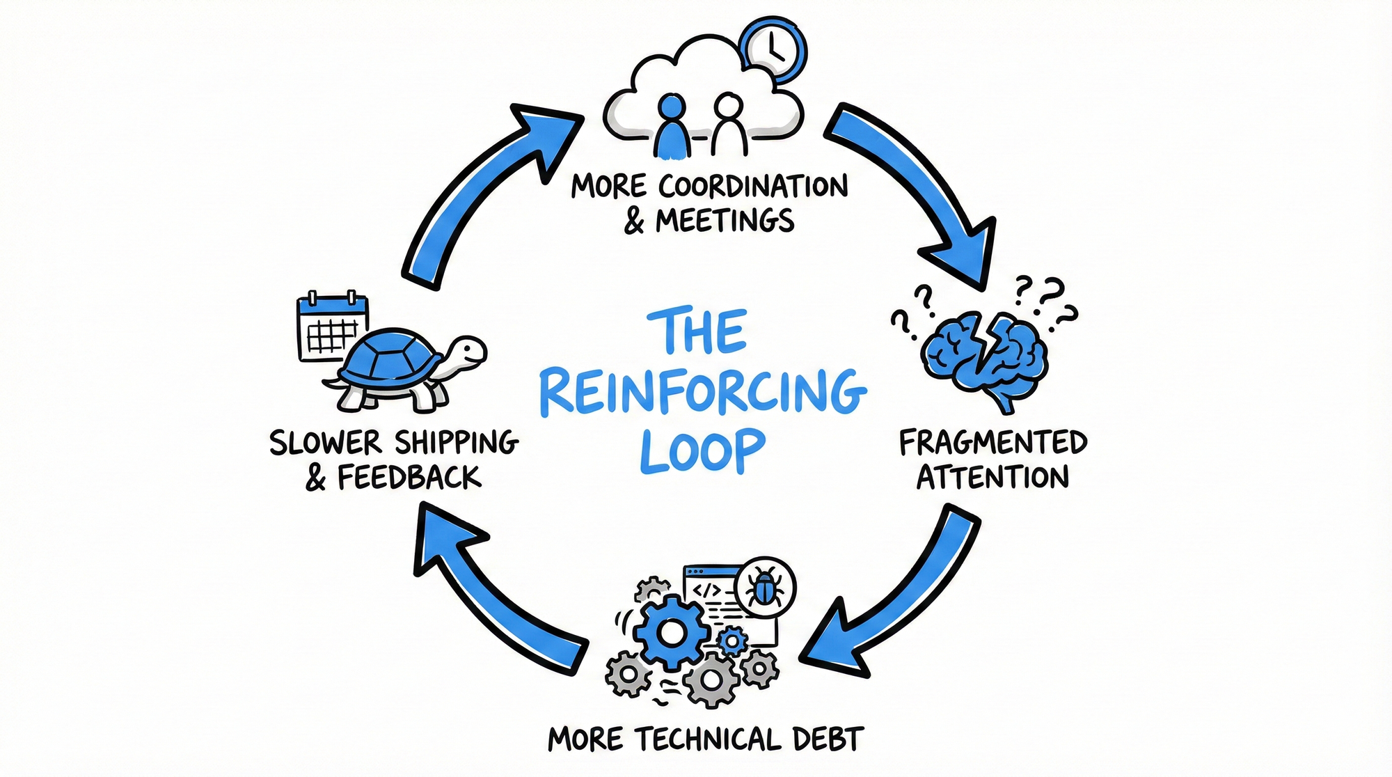 Coordination overhead increases meetings. More meetings fragment attention. Fragmented attention means less time to address technical debt. Unaddressed debt requires more coordination to work around.